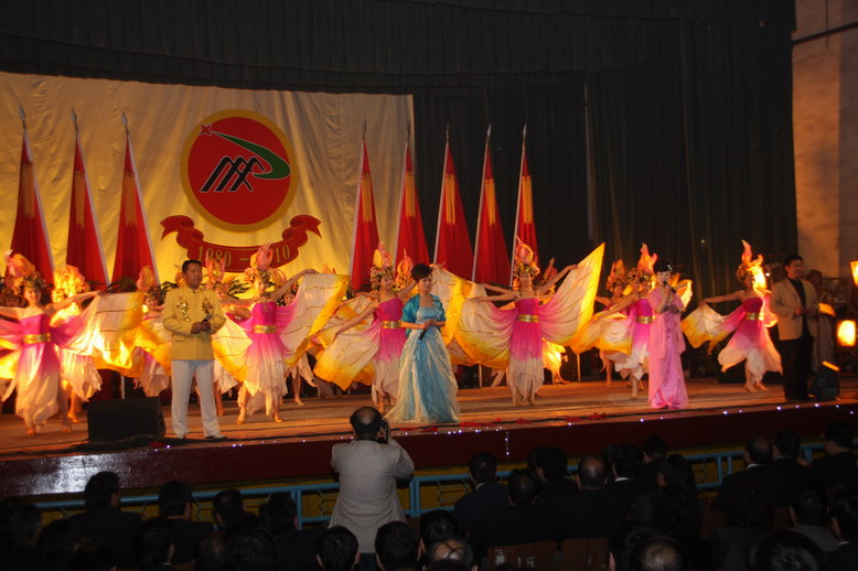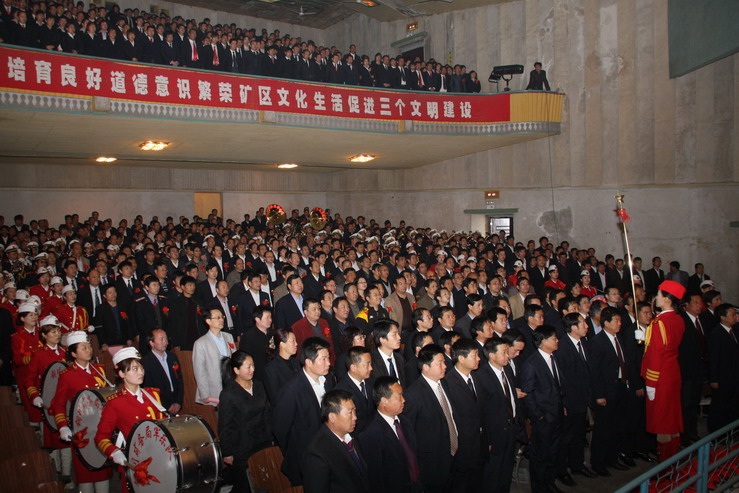 慶祝大會(huì)結(jié)束后,來(lái)賓們一同觀看了文藝演出。舞蹈、歌曲、小品、雜技、魔術(shù)、小提琴獨(dú)奏等13個(gè)節(jié)目紛紛登臺(tái)亮相。演出結(jié)束后,來(lái)賓和該礦全體黨政領(lǐng)導(dǎo)在俱樂(lè)部門前合影留念。隨后,該礦在剛剛建成的欣怡食苑舉行了答謝宴會(huì)。