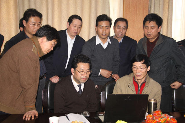 局總工程師劉啟科與鴨口公司董事長總經(jīng)理張會(huì)縣、黨委書記蘭阿利、有關(guān)治水專家一起在觀看鴨口井下涌水錄象和圖片資料,進(jìn)行討論研究