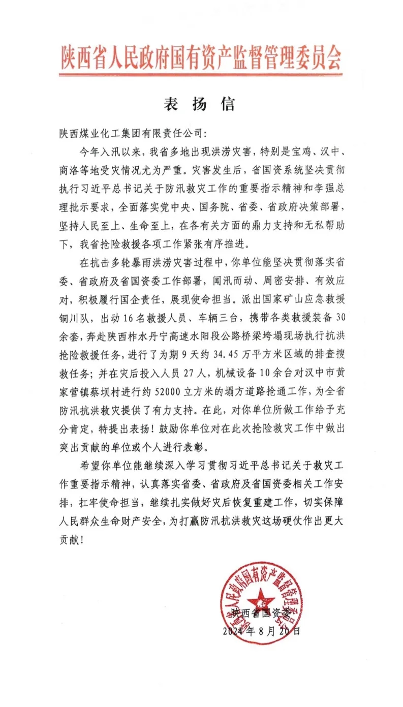 近日,陜西省國資委向陜煤集團(tuán)發(fā)來表揚(yáng)信,對(duì)集團(tuán)堅(jiān)決貫徹落實(shí)省委、省政府及省國資委工作部署,履行國企責(zé)任,展現(xiàn)使命擔(dān)當(dāng),派出集團(tuán)所屬的國家礦山應(yīng)急救援銅川隊(duì)(公司救護(hù)大隊(duì))全力馳援陜西柞水丹寧高速水陽段公路橋梁垮塌抗洪搶險(xiǎn)救援所做的工作給予了充分肯定和表揚(yáng)。