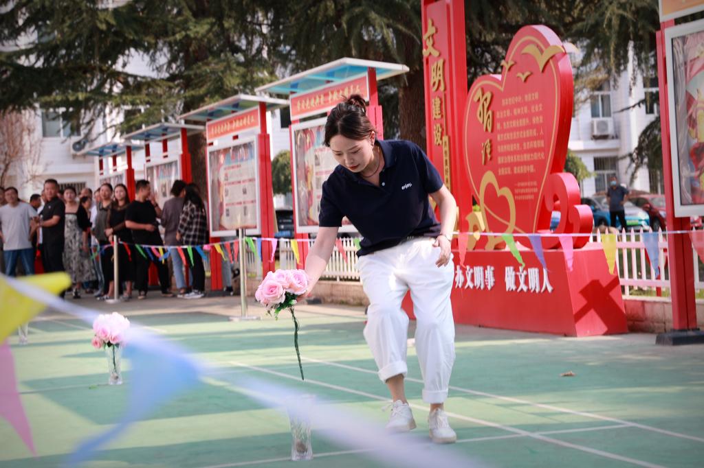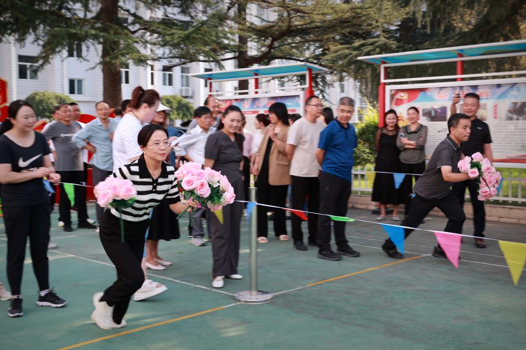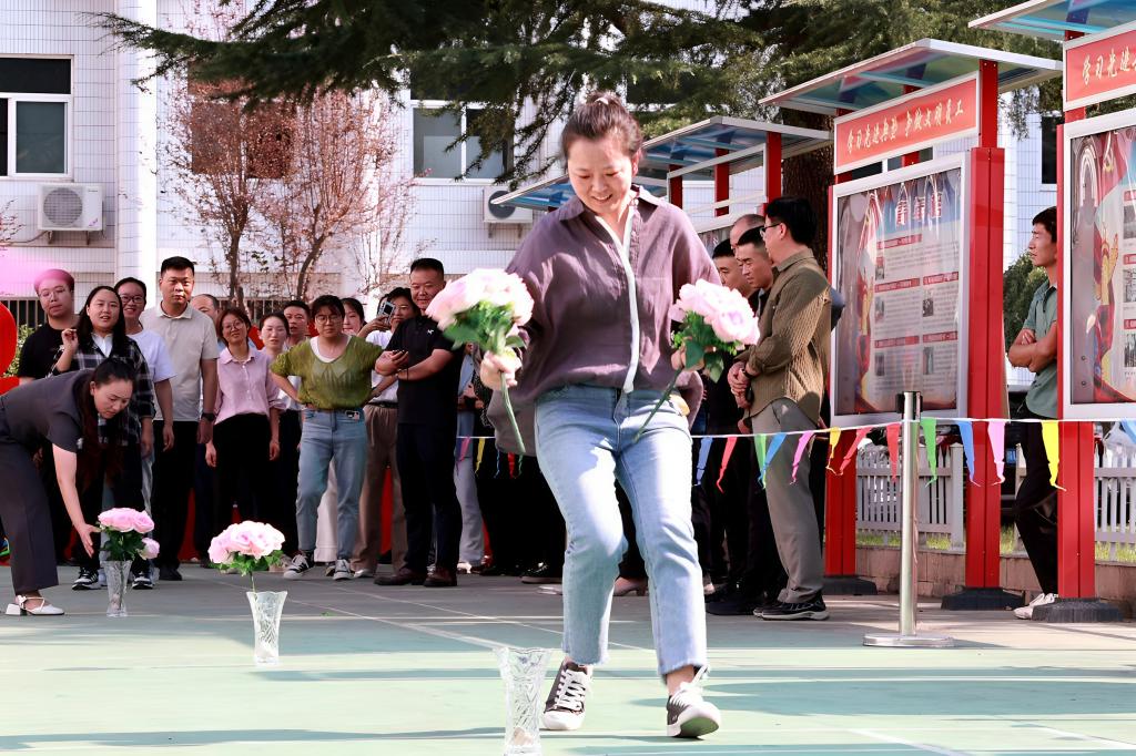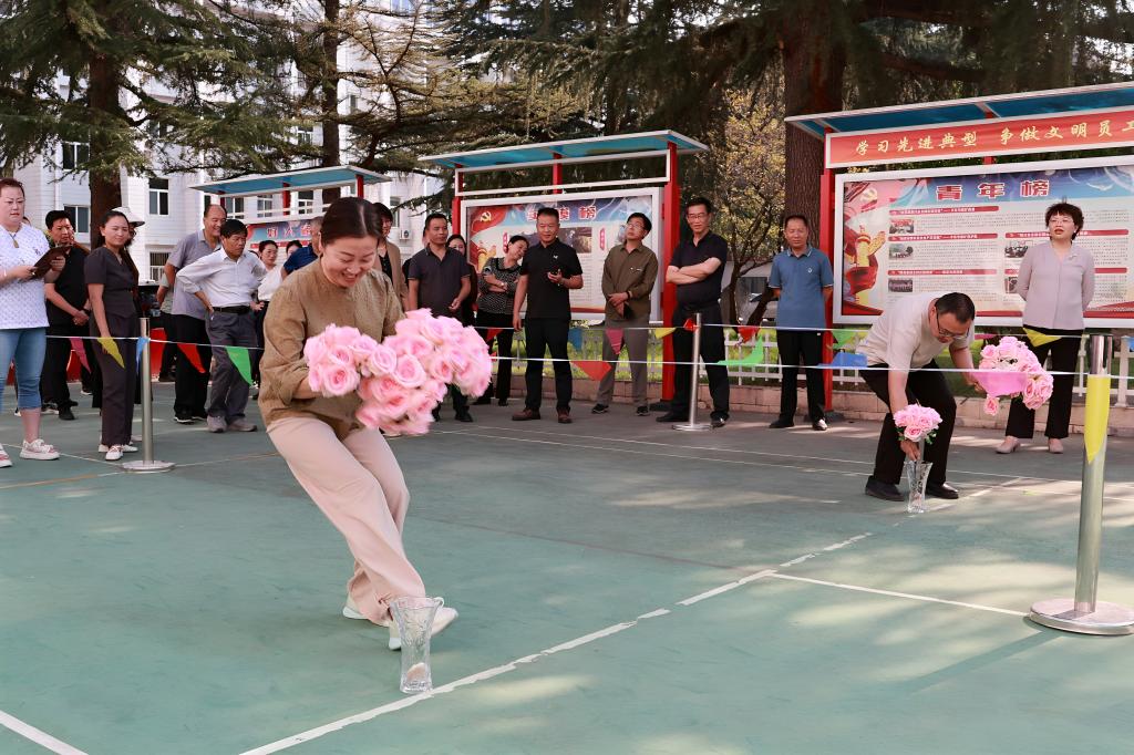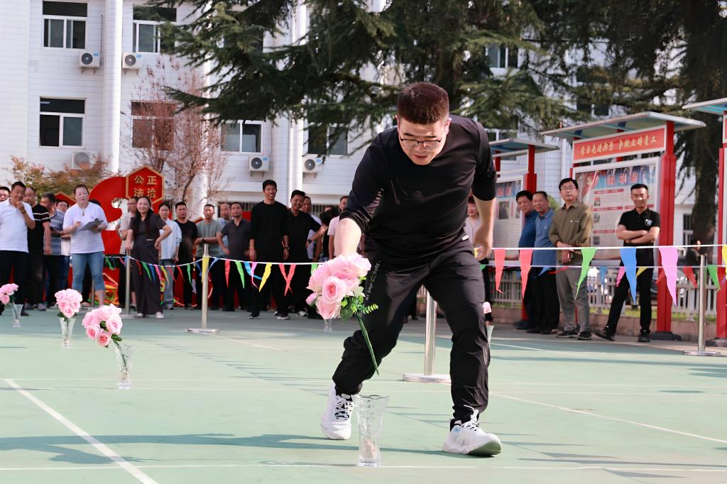 在“春種秋收”活動中,每組隊員由第一名隊員開始將道具花放入花瓶中跑到終點,并在返回起點時將花收回交于第二名選手繼續(xù)重復前一名隊員動作,用時最短參與隊名次越靠前。