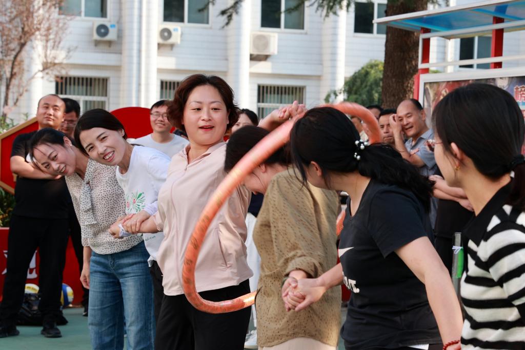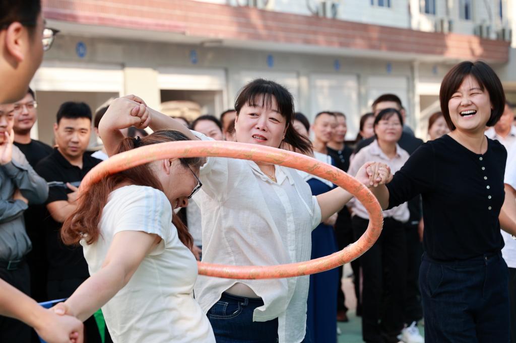 在“一圈到底”活動中,每組隊員形成橫隊,手手相連,依靠肢體將呼啦圈穿過每個隊員,往返一次,用時最短參與隊名次越靠前。