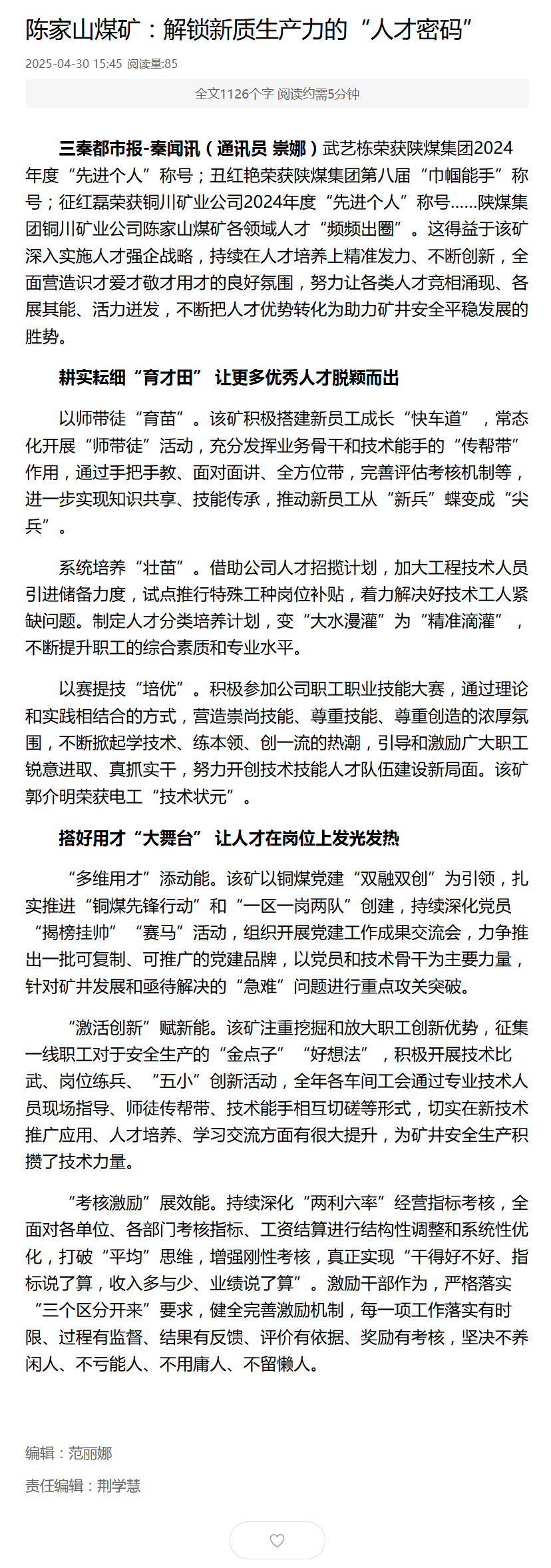 三秦網(wǎng)| 陳家山煤礦:解鎖新質(zhì)生產(chǎn)力的“人才密碼”