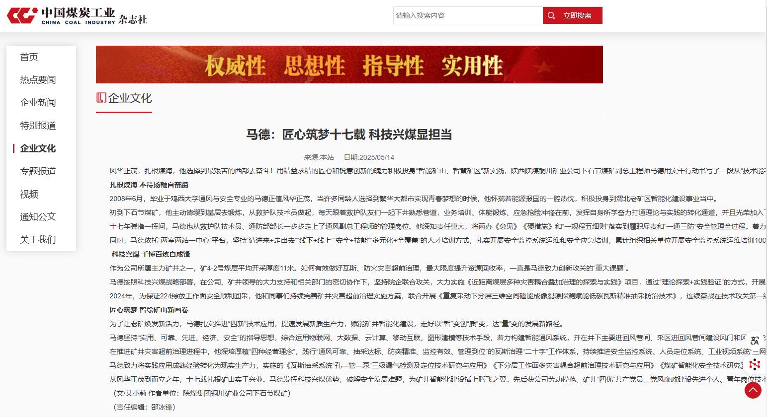 中國(guó)煤炭工業(yè)雜志| 馬德:匠心筑夢(mèng)十七載 科技興煤顯擔(dān)當(dāng)