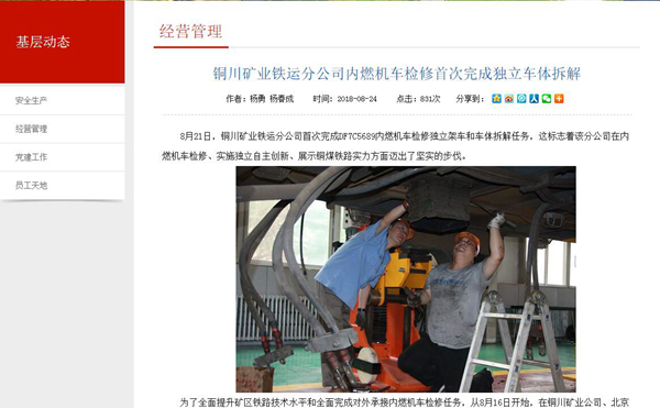 8月21日,銅川礦業(yè)鐵運分公司首次完成DF7C5689內(nèi)燃機車檢修獨立架車和車體拆解任務(wù),這標志著該分公司在內(nèi)燃機車檢修、實施獨立自主創(chuàng)新、展示銅煤鐵路實力方面邁出了堅實的步伐。