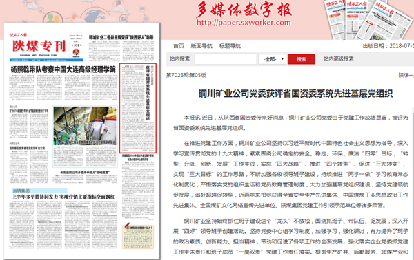 本報訊 近日,從陜西省國資委傳來好消息,銅川礦業(yè)公司黨委由于黨建工作成績顯著,被評為省國資委系統(tǒng)先進基層黨組織。