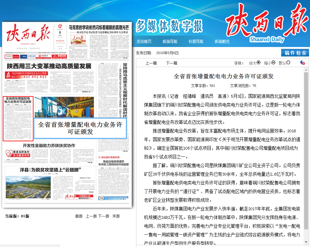 首張?jiān)隽颗潆姽╇婎愲娏I(yè)務(wù)許可證的獲得,意味著銅川欣榮配售電公司擁有了開展電力業(yè)務(wù)的“通行證”、具備了試點(diǎn)配電區(qū)域內(nèi)的供電營(yíng)業(yè)資質(zhì),也標(biāo)志著老礦區(qū)企業(yè)轉(zhuǎn)型發(fā)展取得積極成效。