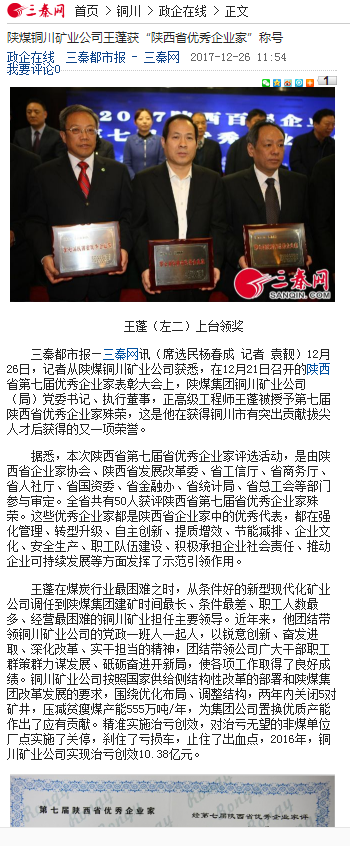 三秦網(wǎng):陜煤銅川礦業(yè)公司王蓬獲“陜西省優(yōu)秀企業(yè)家”稱號