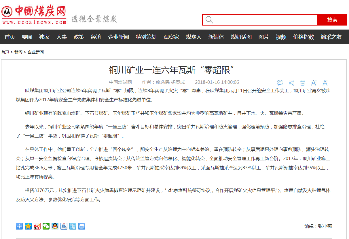 陜煤集團銅川礦業(yè)公司連續(xù)6年實現(xiàn)了瓦斯“零”超限,連續(xù)8年實現(xiàn)了火災“零”隱患,在陜煤集團元月11日召開的安全工作會上,銅川礦業(yè)再次被陜煤集團評為2017年度安全生產(chǎn)先進集體和安全生產(chǎn)標準化先進單位。