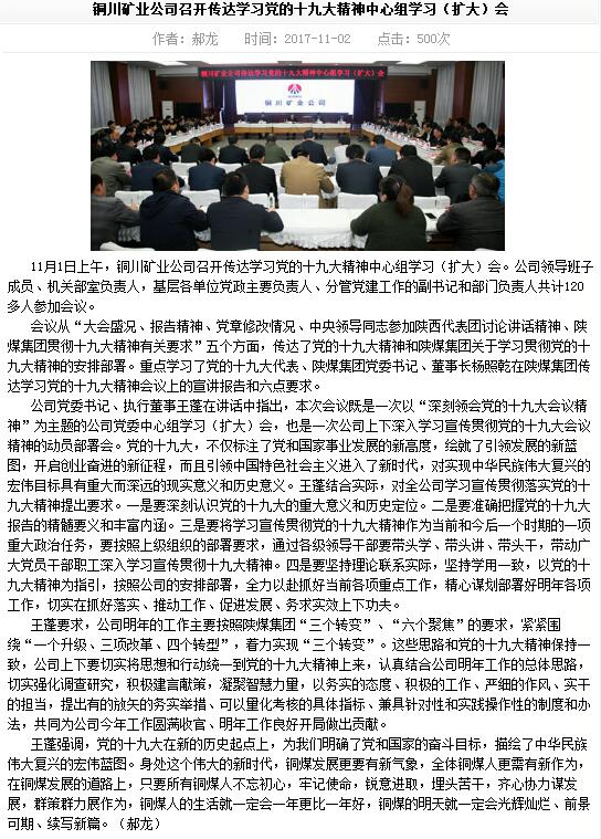集團網(wǎng)站:銅川礦業(yè)公司召開傳達學習黨的十九大精神中心組學習(擴大)會