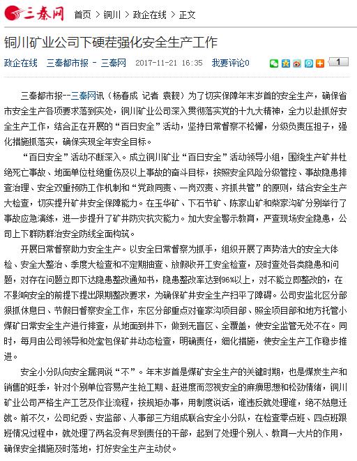 為了切實(shí)保障年末歲首的安全生產(chǎn),確保省市安全生產(chǎn)各項(xiàng)要求落到實(shí)處,銅川礦業(yè)公司深入貫徹落實(shí)黨的十九大精神,全力以赴抓好安全生產(chǎn)工作,結(jié)合正在開展的“百日安全”活動(dòng),堅(jiān)持日常督察不松懈,分級(jí)負(fù)責(zé)壓擔(dān)子,強(qiáng)化措施抓落實(shí),確保實(shí)現(xiàn)全年安全目標(biāo)。