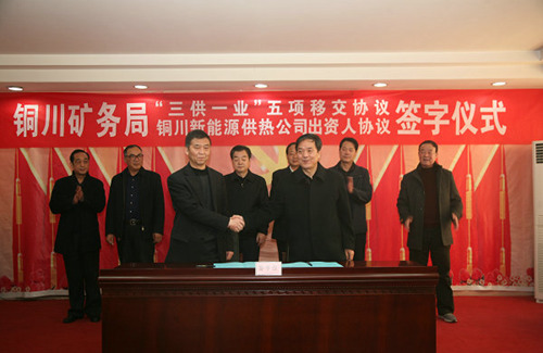 簽約儀式上,銅川礦務(wù)局和銅川華遠(yuǎn)實業(yè)有限公司簽訂了“三供一業(yè)”五項移交協(xié)議;銅川礦務(wù)局和銅川市天然氣公司簽訂了“銅川新能源供熱有限公司”出資人協(xié)議和“銅川新能源供熱有限公司”公司章程,為下一步工作有序開展作了良好鋪墊。