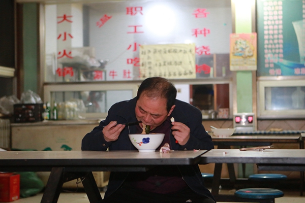 洗完澡來到食堂,李保舉要了碗油潑面,狼吞虎咽地吃了起來。他說這是他一天最開心的時刻。從早上7點到現(xiàn)在已經15個小時了。(圖⑦)