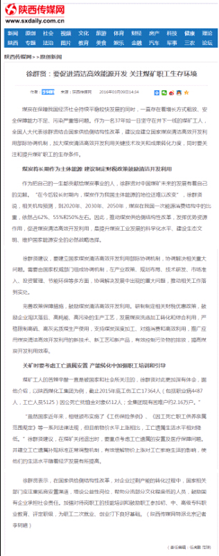 陜西傳媒網(wǎng):徐群賢:要促進清潔高效能源開發(fā) 關(guān)注煤礦職工生存環(huán)境