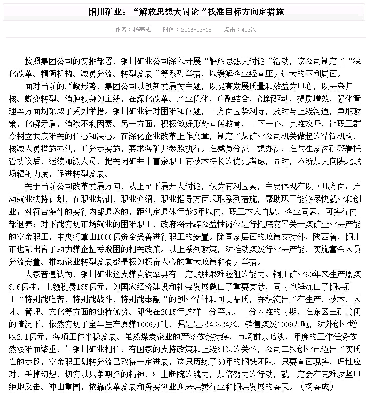 按照集團(tuán)公司的安排部署,銅川礦業(yè)公司深入開展“解放思想大討論”活動,該公司制定了“深化改革、精簡機構(gòu)、減員分流、轉(zhuǎn)型發(fā)展”等系列舉措,以緩解企業(yè)經(jīng)營壓力過大的不利局面。