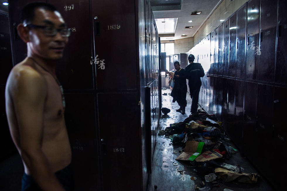礦上的浴室內(nèi)到處是被分流的礦工扔掉的舊工作服和井下用品。 (來自:騰訊圖片)