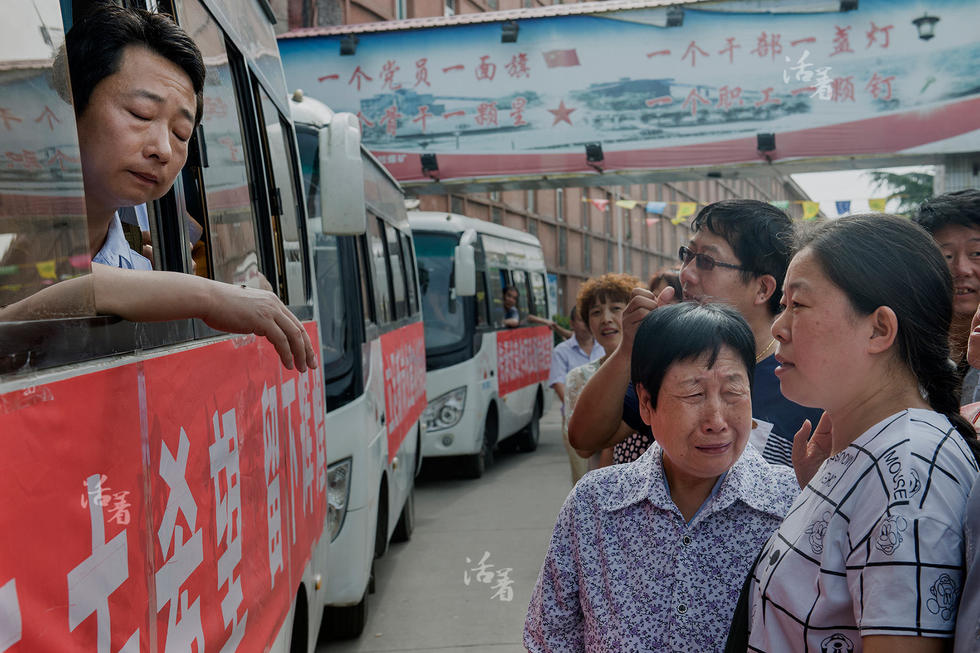 被分流的井下運(yùn)銷區(qū)工人劉小銅坐在即將開走的車上和母親、妻子道別。 (來自:騰訊圖片)
