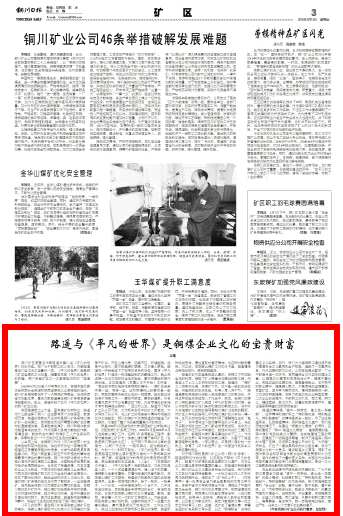對(duì)于銅川特別是銅川礦業(yè)公司(銅川礦務(wù)局),路遙掛職創(chuàng)作的過(guò)程,以及誕生于斯的《平凡的世界》,都是不可多得的極其寶貴的文化遺產(chǎn),它對(duì)企業(yè)文化建設(shè)具有特殊重要的意義。在路遙的積極影響下,我們的企業(yè)文化建設(shè)目標(biāo)遠(yuǎn)大而堅(jiān)定,我們的職工文藝創(chuàng)作呈現(xiàn)持續(xù)繁榮,一大批文學(xué)創(chuàng)作人才和優(yōu)秀作品脫穎而出,涌現(xiàn)出了《礦長(zhǎng)的上午》、《昨夜簫聲》等一批具有全省乃至全國(guó)影響的優(yōu)秀文學(xué)作品,各類(lèi)中省市文學(xué)獎(jiǎng)項(xiàng)層出不窮,涌現(xiàn)出了中國(guó)作家協(xié)會(huì)會(huì)員、銅川市作協(xié)主席黃衛(wèi)平,陜西省德藝雙馨優(yōu)秀作家、陜西煤化作協(xié)副主席楊治華,小說(shuō)作家楊生武、輪椅詩(shī)人王鐵毛、煤炭詩(shī)人李祥云和李建榮,以及散文作家蘭阿利、曲藝作家黎樹(shù)文等一批文藝創(chuàng)作的骨干人物。這里,還產(chǎn)生了譽(yù)滿三秦、聲震全國(guó)的礦務(wù)局職工軍樂(lè)團(tuán),以及“銅煤歌會(huì)”這樣的著名文化品牌。另外,我們大力倡導(dǎo)職工通過(guò)讀書(shū)學(xué)習(xí)提高科學(xué)文化素質(zhì)和生產(chǎn)技能,造就了一支素質(zhì)優(yōu)良、作風(fēng)過(guò)硬的職工隊(duì)伍。公司黨政提出要求:廣大干部每月讀一本好書(shū),寫(xiě)兩篇結(jié)合工作實(shí)際的理論文章,以提高文化素質(zhì)和思想政治水平,提高干事創(chuàng)業(yè)、克難攻堅(jiān)的過(guò)硬本領(lǐng),提高愛(ài)崗敬業(yè)、忠于職守的職業(yè)操守,提高凝心聚力、不畏困難的堅(jiān)強(qiáng)意志。百里礦區(qū),讀書(shū)學(xué)習(xí)蔚然成風(fēng),精神面貌煥然一新,工作成效明顯提高。在努力實(shí)施加快企業(yè)轉(zhuǎn)型發(fā)展、二次創(chuàng)業(yè)的進(jìn)程中,干部職工識(shí)大體,顧大局,明大義,精誠(chéng)團(tuán)結(jié),努力作為,向著戰(zhàn)勝困難度嚴(yán)冬,建設(shè)強(qiáng)局再輝煌的目標(biāo)昂然奮進(jìn)!