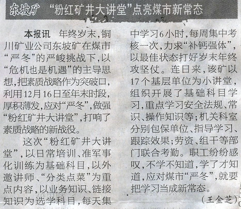 ★ 12月30日“陜西工人報”刊發(fā)《東坡礦“粉紅礦井大講堂”點亮煤市新常態(tài)》(作者:王金芝)