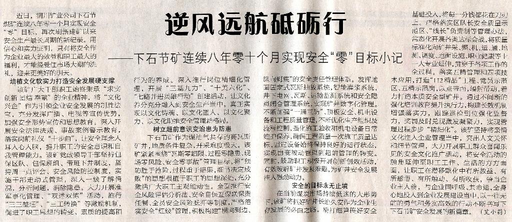★ 12月30日“陜西工人報”刊發(fā)《逆風遠航砥礪行--下石節(jié)礦連續(xù)八年零十個月實現(xiàn)安全“零”目標小記》(作者:艾小莉)