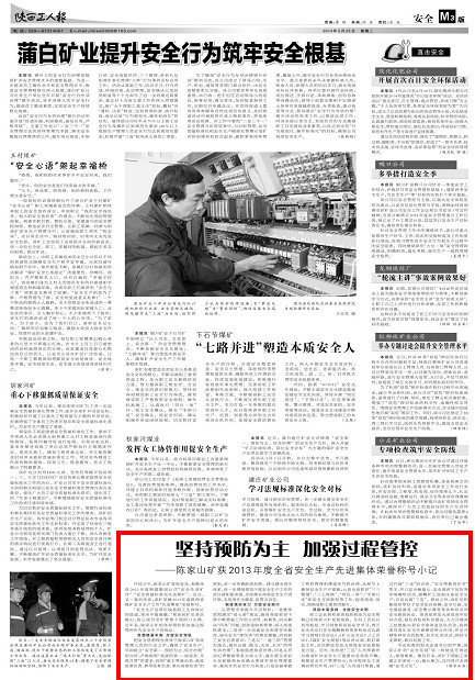 開局之年,陳家山礦喜報(bào)連連,相繼榮獲2013年度陜煤集團(tuán)公司“安全先進(jìn)礦井”、“安全質(zhì)量標(biāo)準(zhǔn)化先進(jìn)煤礦”。近日,又一喜訊傳來,該礦榮摘2013年度陜西省煤礦安全生產(chǎn)工作“先進(jìn)集體”榮譽(yù)稱號(hào)。“安全生產(chǎn)這條紅線是職工生命保證的底線,堅(jiān)決不能碰觸?!毙蠌┟竦V長(zhǎng)多次提出,現(xiàn)已成為全礦管理干部的口頭禪。近年來,陳家山礦把堅(jiān)持預(yù)防和加強(qiáng)過程管控作為安全生產(chǎn)的保證。