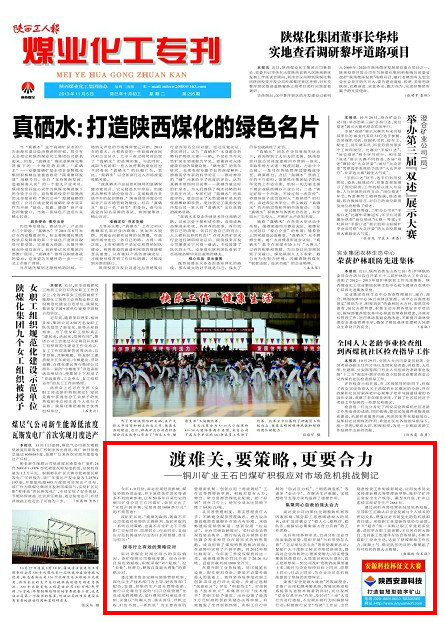 陜西工人報(bào) 2013年11月5日 頭版 渡難關(guān),要策略,更要合力——銅川礦業(yè)王石凹煤礦積極應(yīng)對市場危機(jī)挑戰(zhàn)側(cè)記 今年1-9月份,面對宏觀經(jīng)濟(jì)影響、煤炭價格持續(xù)走低、井下地質(zhì)條件惡劣等諸多不利因素影響,已有50多年開采歷史的銅川礦業(yè)公司王石凹煤礦,如何交出了“實(shí)現(xiàn)產(chǎn)銷平衡、完成利潤1600多萬元”的不易答卷?該礦礦長說:“成績的取得,既離不開公司黨政對形勢的正確研判、及時采取的一系列應(yīng)對策略,也離不開全礦上下干部職工目標(biāo)同向、思想同心、行動同步,直面應(yīng)對危機(jī)挑戰(zhàn)所付出的汗水和智慧、責(zé)任與擔(dān)當(dāng)!”