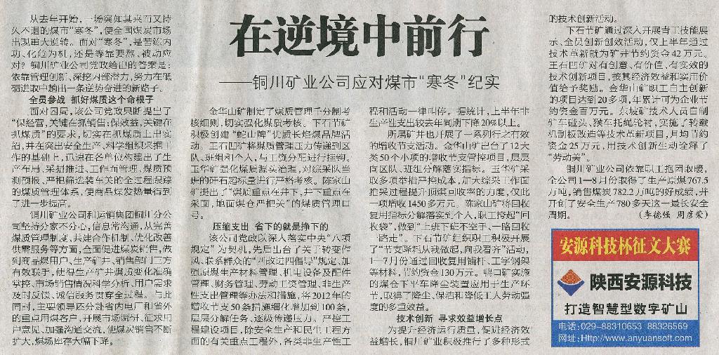 ●10月1日“陜西工人報(bào)”頭版刊發(fā)《在逆境中前行--銅川礦業(yè)公司應(yīng)對(duì)煤市“寒冬”紀(jì)實(shí)》(作者:李德強(qiáng) 周彥榮)