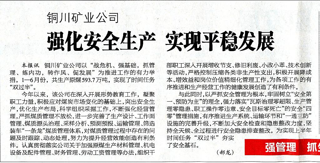 ★ 7月30日“陜西工人報”刊發(fā)《銅川礦業(yè)公司強化安全生產 實現(xiàn)平穩(wěn)發(fā)展》(作者:郝龍)