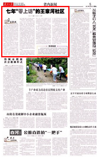 陜西日報 2013年8月9日 第五版 “你看,這社區(qū)的領導真真為咱職工群眾辦成了清潔供暖、飲水改造、道路改造、環(huán)境改造、舊樓改造等數(shù)十件好事、實事,使俺們能更有尊嚴、更加體面的生活……這社區(qū)是一心為民、關注民生、為民辦事、群眾信得過的和諧大家園,解決了王家河礦區(qū)幾十年想解決而沒有解決的件件老大難問題,我們打心眼里擁護和愛戴社區(qū)的好領導?!庇猛跫液由鐓^(qū)住了幾十年的退休職工張大爺?shù)脑捳f,就是“這變化一兩句話很難說清楚,只是這五六年的變化比前20年都快,大家都說好。知道不?俺這社區(qū)都連續(xù)7年無赴省進京越級上訪、集體上訪了……”王家河社區(qū)的前身是下馬的王家河煤礦,管轄王家河一號井、老礦部、斜井3個家屬區(qū),跨距5公里;直接管理和服務離退休人員1078人、工(?。┩鲞z屬297人、上世紀60年代精簡下放人員17人、70年代致殘返鄉(xiāng)人員12人、享受養(yǎng)老補貼人員601人、一次性安置人員281人,還有勞動服務公司集體工已退休和未退休198人,以及家屬7200多人。地盤大了問題多,人口多了事也多。面對一次性安置人員、工(?。┩鲞z屬、退休人員等問題,面對歷史遺留問題多、困難群體多等難題。