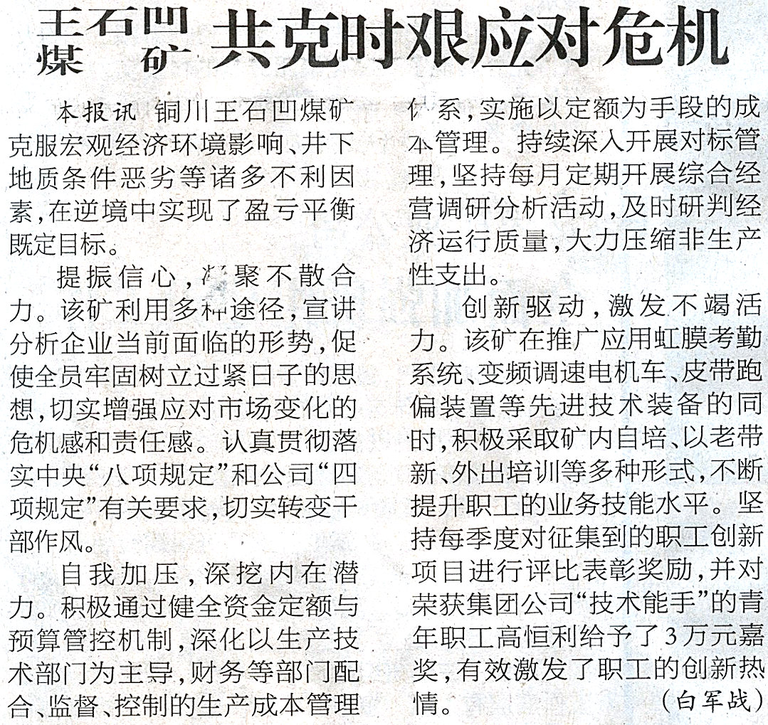 ●6月18日“陜西工人報”煤業(yè)二版刊發(fā)《王石凹煤礦共克時艱應對危機 》