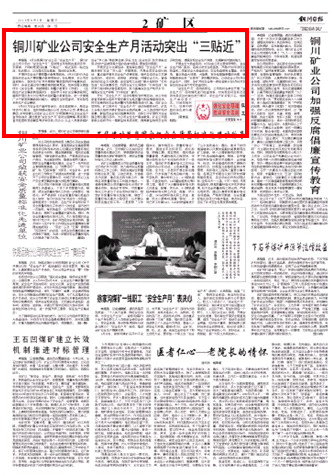 6月份是銅川礦業(yè)公司“安全生產(chǎn)月”,銅川礦業(yè)公司今年的“安全生產(chǎn)月”活動(dòng)同往年相同的是動(dòng)手早、安排細(xì),不同的是更加注重“三貼近”:貼近實(shí)際、貼近生活、貼近群眾,以此強(qiáng)化安全基礎(chǔ),推動(dòng)安全發(fā)展。