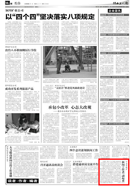 本報(bào)訊銅川下石節(jié)煤礦新聞宣傳工作表彰會(huì)之后,在該礦新聞宣傳工作者中刮起了一場(chǎng)“互學(xué)風(fēng)”,大家齊心協(xié)力為搞好對(duì)內(nèi)對(duì)外宣傳工作動(dòng)了起來。