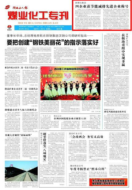 陜西工人報(bào) 2013年元月8日 頭版 近日,從中國煤炭工業(yè)協(xié)會(huì)和中國煤炭加工利用協(xié)會(huì)傳來喜訊,陜煤化集團(tuán)所屬的黃陵礦業(yè)公司、銅川礦業(yè)公司、澄合礦業(yè)公司及陜西中能煤田公司被評為2010-2011年度煤炭工業(yè)節(jié)能減排先進(jìn)企業(yè)。陜煤化集團(tuán)自成立以來,緊密結(jié)合國家的產(chǎn)業(yè)政策,堅(jiān)持以科技創(chuàng)新為支撐,遵循“減量化、再利用、再循環(huán)”的原則,通過老礦區(qū)技術(shù)改造、新礦區(qū)的產(chǎn)能升級,實(shí)現(xiàn)了高產(chǎn)高效開采;加大礦井廢水、煤矸石、煤泥、粉煤灰、煤氣層的利用力度,引導(dǎo)下屬企業(yè)由依靠煤炭產(chǎn)量的增長轉(zhuǎn)到提高煤炭綜合開發(fā)利用的質(zhì)量和效益上來,實(shí)現(xiàn)了煤與煤伴生資源的綜合開發(fā)、深度加工、清潔利用,發(fā)展生態(tài)煤炭工業(yè)。
