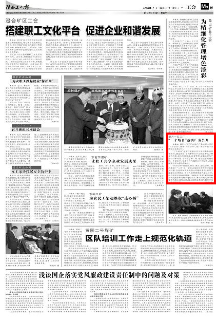 陜西工人報 2013年元月8日 煤業(yè)三版 銅川一五三廠在推行廠務(wù)公開中實行“三個結(jié)合”,確?!八狞c公開”,把廠務(wù)公開置于全體職工監(jiān)督之下。“三個結(jié)合”是實行班組公開與車間事務(wù)公開相結(jié)合,通過班組、車間事務(wù)公開讓職工群眾了解身邊的事,參與車間事務(wù)、班務(wù)管理;黨務(wù)公開與廠務(wù)公開相結(jié)合,讓職工了解廠情,把企業(yè)管理提高到一個新水平;定期公開與隨時公開相結(jié)合,以此提高公開內(nèi)容的實效性。