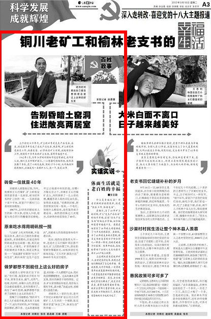 在銅川,當了40年礦工的劉順,礦上“先生產(chǎn)后生活”時他不幸福,后來“邊生產(chǎn)邊生活”時他也不幸福,如今他卻顯得幸福感十足。原因是他家住了40年的土磚窯換成了73平米的兩居室。在榆林,當了42年村支書的王恩則,剛當支書時自家的日子和全村人一樣苦一樣窮,住的是破房子爛窯洞。改革開放后,在他的帶領(lǐng)下全村人大米白面不離口,63戶住上別墅。