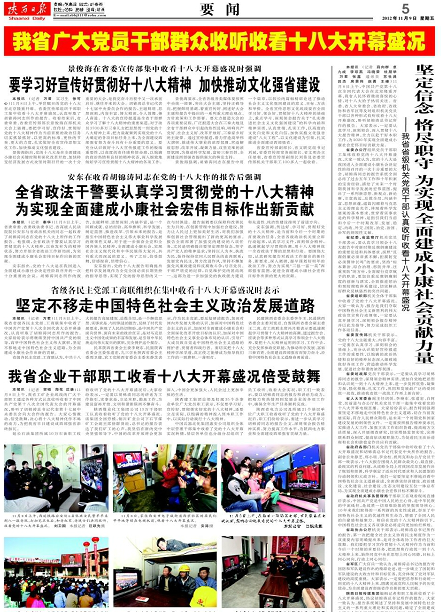 陜西日?qǐng)?bào) 2012年11月9日 第五版 11月8日上午,我省工礦企業(yè)戰(zhàn)線的廣大干部職工通過(guò)各種方式認(rèn)真收聽(tīng)收看了中國(guó)共產(chǎn)黨第十八次全國(guó)代表大會(huì)的開(kāi)幕盛況,聆聽(tīng)了胡錦濤總書記代表第十七屆中央委員會(huì)向大會(huì)作的報(bào)告。大家心情激動(dòng),倍受鼓舞,決心將十八大精神化作不竭的動(dòng)力,為把我省早日建設(shè)成西部強(qiáng)省添磚加瓦。延長(zhǎng)石油集團(tuán)所屬10萬(wàn)石油職工收看收聽(tīng)了黨的十八大開(kāi)幕盛況后,大家紛紛表示,一定要以胡錦濤同志的講話為工作指引,實(shí)事求是,立足本職,勤懇工作,為建設(shè)富裕開(kāi)放、文明和諧新陜西不懈奮斗。