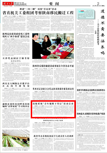 本報(bào)訊(喜 順)4月8日,由省委宣傳部組織的陜西出版集團(tuán)“青年編輯走基層”主題實(shí)踐教育活動(dòng)在西安啟動(dòng)。