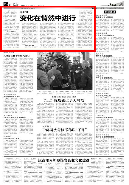 如今,干部下井人人裝一小本,隨時記錄問題,及時處理、匯報,上情下達、下情上傳。礦領(lǐng)導(dǎo)分別深入井下一線,率先嚴(yán)格安全、質(zhì)量現(xiàn)場管理,把干事創(chuàng)業(yè)的激情傳遞到礦井第一線……改變從干部悄然而始。