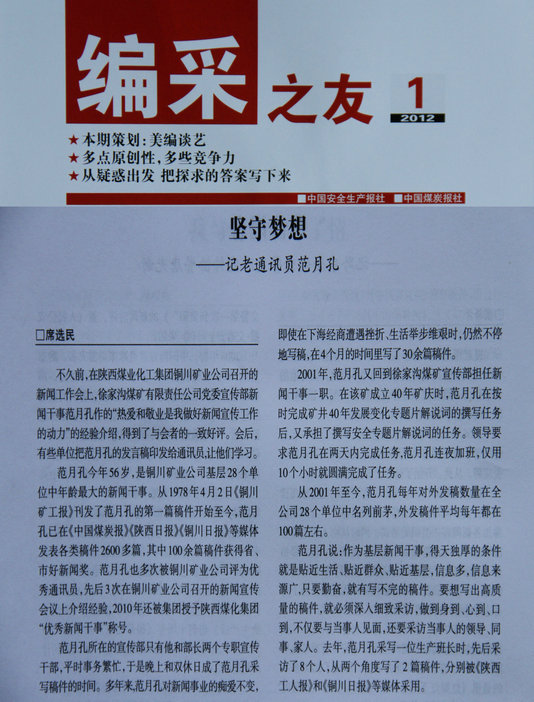 范月孔今年56歲,是銅川礦業(yè)公司基層28個單位中年齡最大的新聞干事。從1978年4月2日在《銅川礦工報》發(fā)表第一篇稿件開始,至今已在《中國煤炭報》、《陜西日報》、《銅川日報》、陜西人民廣播電臺等媒體發(fā)表各類稿件2600多篇,100余篇稿件獲得省市新聞獎。范月孔也多次被銅川礦業(yè)公司評為優(yōu)秀通訊員,2010年還被集團(tuán)授予陜西煤化集團(tuán)“優(yōu)秀新聞干事”稱號。