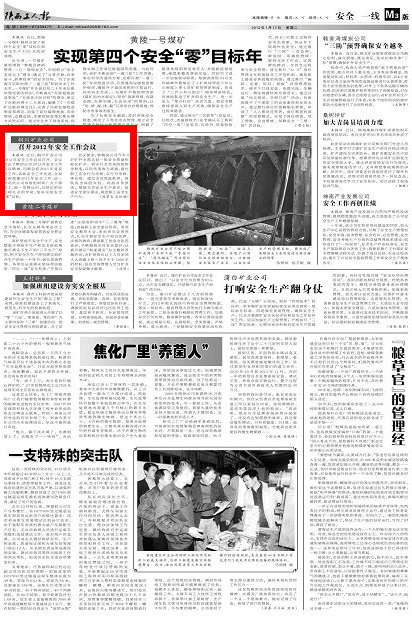 (劉孝文王忙鎖)本報(bào)訊近日,銅川礦業(yè)公司2012年安全工作會(huì)議召開。會(huì)議傳達(dá)了集團(tuán)公司2012年安全工作會(huì)議精神,回顧總結(jié)2011年度安全工作,表彰安全工作先進(jìn),全面安排部署2012年安全工作,進(jìn)一步動(dòng)員公司各級(jí)組織和廣大干部職工,統(tǒng)一思想認(rèn)識(shí),以堅(jiān)定的信心和扎實(shí)的作風(fēng),堅(jiān)決實(shí)現(xiàn)安全“零”目標(biāo)。
