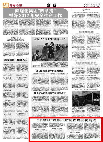 2011年10月到12月,該公司挑選11個基層單位的骨干通訊員開展交叉采訪,這些新聞干事分別深入到11個單位的區(qū)隊、車間、班組、井下和職工宿舍、食堂、澡堂體驗礦工生活,采寫了18篇生動、鮮活,具有厚度的稿件,這些稿件在公司內(nèi)外媒體刊發(fā)(播)后,受到礦工及家屬們的廣泛贊揚,在社會上也引起了良好反響。去年慶祝記者節(jié)時,他們結(jié)合“走轉(zhuǎn)改”,組織礦工報和公司網(wǎng)站、畫刊、電視站的記者,別開生面,深入下石節(jié)煤礦的區(qū)隊、班組、井下和職工宿舍,用一整天時間和職工們面對面交談,同他們一起在單身職工食堂就餐,體驗礦工生活環(huán)境,在《陜西工人報》、《各界導(dǎo)報》、西部網(wǎng)、中國煤炭長安網(wǎng)、陜西煤化集團網(wǎng)站等媒體發(fā)表了數(shù)十篇反映礦工生產(chǎn)、生活和精神風(fēng)貌,以及他們所思、所盼的現(xiàn)場短新聞、側(cè)記和特寫等新聞好稿件。