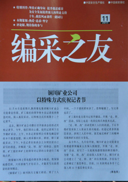 在第十二屆記者節(jié)到來之前的11月6日,陜西煤化集團(tuán)銅川礦業(yè)公司黨委宣傳部,礦工報(bào)社的領(lǐng)導(dǎo)和9名記者放棄星期日休息時(shí)間,冒著小雨、濃霧,用實(shí)踐新聞界“走、轉(zhuǎn)、改”活動(dòng)的實(shí)際行動(dòng)和建立“走、轉(zhuǎn)、改”的長(zhǎng)效機(jī)制慶祝自己的節(jié)日。