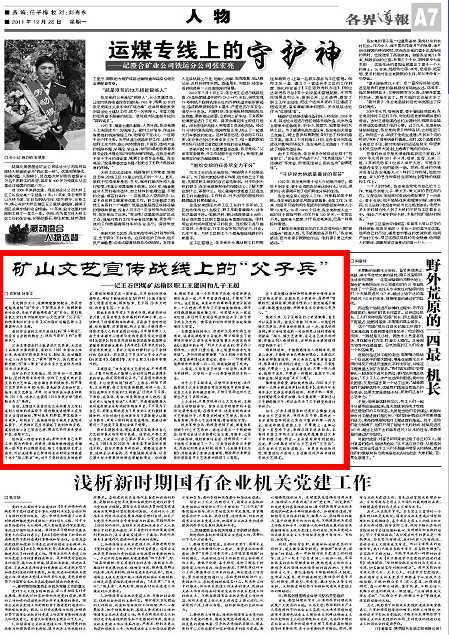 在礦山的文藝陣地上,他30年如一日,默默耕耘,堅(jiān)持利用業(yè)余時(shí)間,創(chuàng)作了大量反映礦區(qū)生活的文藝作品,他自編自演的快板書、相聲等文藝節(jié)目共計(jì)有80余部,曾先后多次參加礦區(qū)、地市、省文藝演出,并有10余部作品分獲各種獎(jiǎng)項(xiàng),2011年,他本人也獲得2010年度礦級(jí)“愛崗敬業(yè)員工”殊榮。