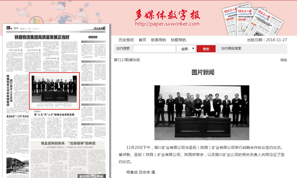 11月20日下午,銅川礦業(yè)有限公司與圣拓(陜西)礦業(yè)有限公司舉行戰(zhàn)略合作協(xié)議簽約儀式。省僑聯(lián)、圣拓(陜西)礦業(yè)有限公司、陜西僑商會,以及銅川礦業(yè)公司的相關(guān)負(fù)責(zé)人共同見證了簽約儀式。