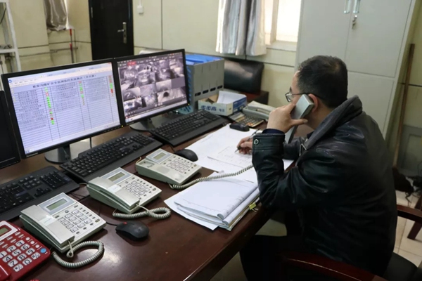 春節(jié)期間,崔家溝項目部調度員王東在調度室內正在接聽井下匯報的情況,并從大屏幕仔細觀察井下變化,認真做著記錄。