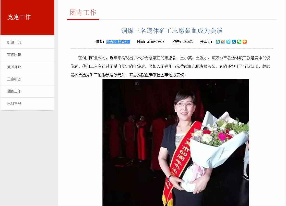在銅川礦業(yè)公司,近年來(lái)涌現(xiàn)出了不少無(wú)償獻(xiàn)血的志愿者,王小英、王發(fā)才、陳萬(wàn)秀三名退休職工就是其中的佼佼者。他們?nèi)嗽诔^(guò)了獻(xiàn)血規(guī)定的年齡后,又加入了銅川市無(wú)償獻(xiàn)血志愿者服務(wù)隊(duì),有的還擔(dān)任了分隊(duì)隊(duì)長(zhǎng),繼續(xù)發(fā)揮余熱為礦工的形象增添光彩,其志愿獻(xiàn)血奉獻(xiàn)社會(huì)事跡成美談。