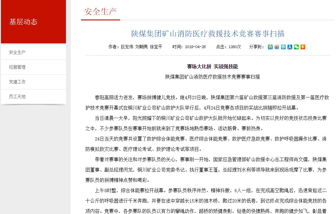 春陽高照活力迸發(fā),賽場拼搏健兒競技。繼4月23日晚,陜煤集團(tuán)第六屆礦山救援第三屆消防救援及第一屆醫(yī)療救護(hù)技術(shù)競賽開幕式在銅川礦業(yè)公司礦山救護(hù)大隊舉行后,4月24日競賽各項(xiàng)目的實(shí)戰(zhàn)比拼隨即拉開戰(zhàn)幕。