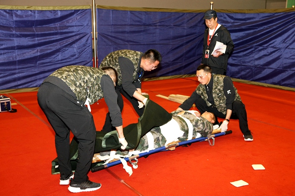室外競賽激烈角逐,位于銅川礦業(yè)公司礦山救護(hù)大隊綜合訓(xùn)練館內(nèi)的醫(yī)療綜合體能競賽中也精彩紛呈。競賽中醫(yī)療救護(hù)各參賽隊隊員緊張忙碌地進(jìn)行著傷員心肺復(fù)蘇及創(chuàng)傷急救,止血、包扎、固定、搬運(yùn)等各個動作相互銜接、標(biāo)準(zhǔn)到位、忙而不亂、緊湊有序,既充分展示了日常訓(xùn)練和實(shí)戰(zhàn)歷練的技術(shù)素養(yǎng),又有效檢驗(yàn)了醫(yī)療救援隊伍的業(yè)務(wù)技能和綜合素質(zhì)。