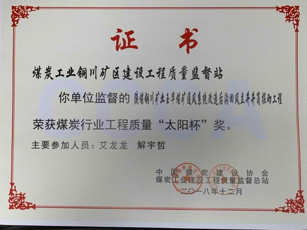 4月26日,中國(guó)煤炭工業(yè)建設(shè)工程質(zhì)量監(jiān)督總站在西安市召開(kāi)“2019年度煤炭建設(shè)行業(yè)創(chuàng)先爭(zhēng)優(yōu)表彰會(huì)”上,由銅川礦區(qū)建設(shè)工程質(zhì)量監(jiān)督站監(jiān)督的玉華煤礦通風(fēng)系統(tǒng)改造后溝回風(fēng)立井井筒掘砌工程,被授予“煤炭行業(yè)優(yōu)質(zhì)工程”和“太陽(yáng)杯”榮譽(yù)稱(chēng)號(hào)。該獎(jiǎng)項(xiàng)為煤炭行業(yè)工程質(zhì)量最高獎(jiǎng)。