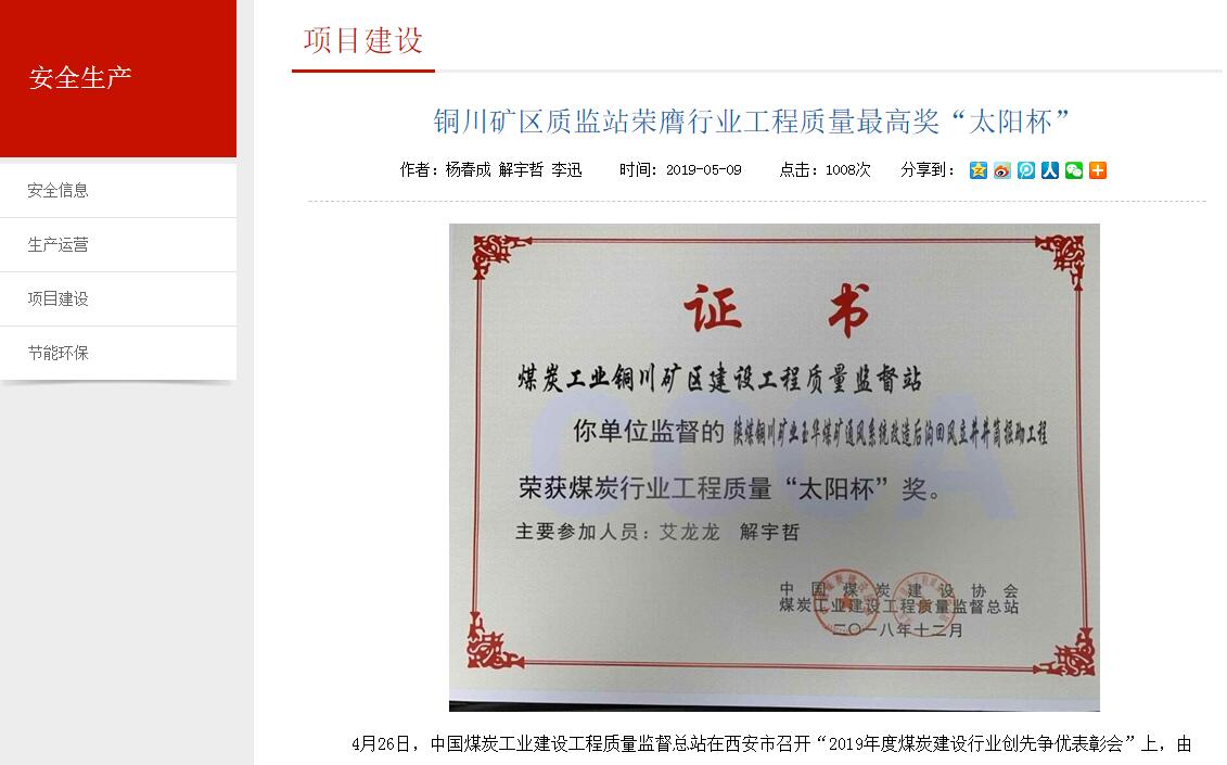 集團(tuán)網(wǎng):銅川礦區(qū)質(zhì)監(jiān)站榮膺行業(yè)工程質(zhì)量最高獎(jiǎng)“太陽(yáng)杯”