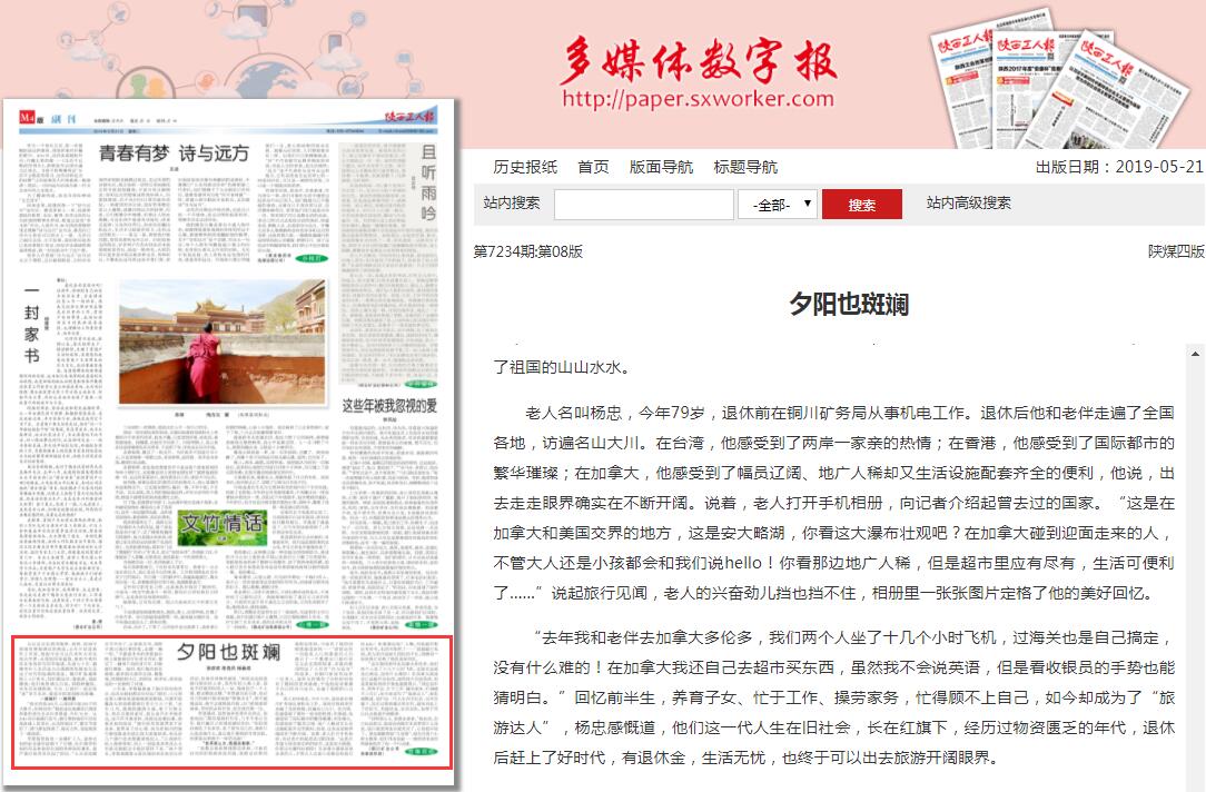 老人名叫楊忠,今年79歲,退休前在銅川礦務(wù)局從事機(jī)電工作。退休后他和老伴走遍了全國各地,訪遍名山大川。在臺灣,他感受到了兩岸一家親的熱情;在香港,他感受到了國際都市的繁華璀璨;在加拿大,他感受到了幅員遼闊、地廣人稀卻又生活設(shè)施配套齊全的便利,他說,出去走走眼界確實在不斷開闊。說著,老人打開手機(jī)相冊,向記者介紹起曾去過的國家?!斑@是在加拿大和美國交界的地方,這是安大略湖,你看這大瀑布壯觀吧?在加拿大碰到迎面走來的人,不管大人還是小孩都會和我們說hello!你看那邊地廣人稀,但是超市里應(yīng)有盡有,生活可便利了……”說起旅行見聞,老人的興奮勁兒擋也擋不住,相冊里一張張圖片定格了他的美好回憶。